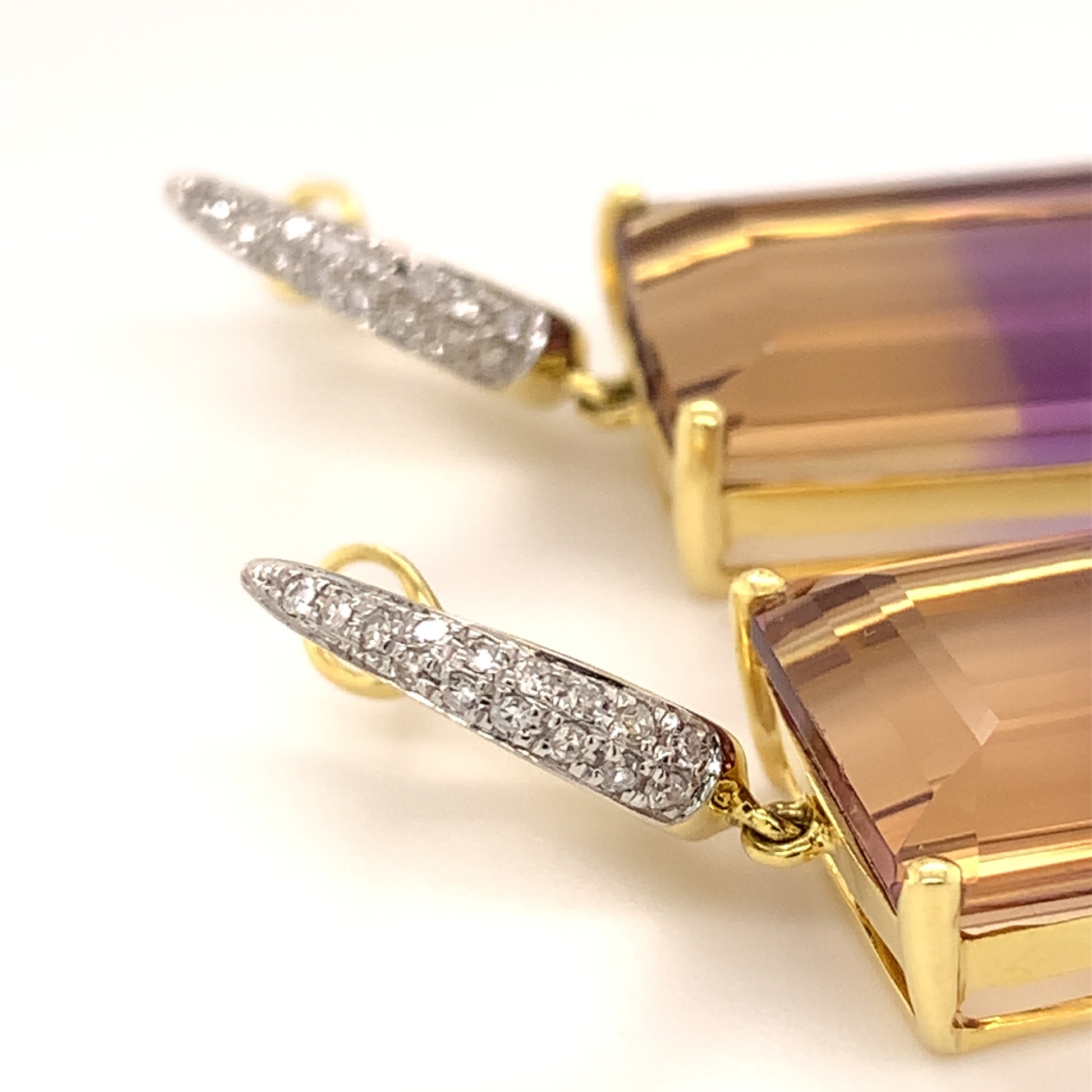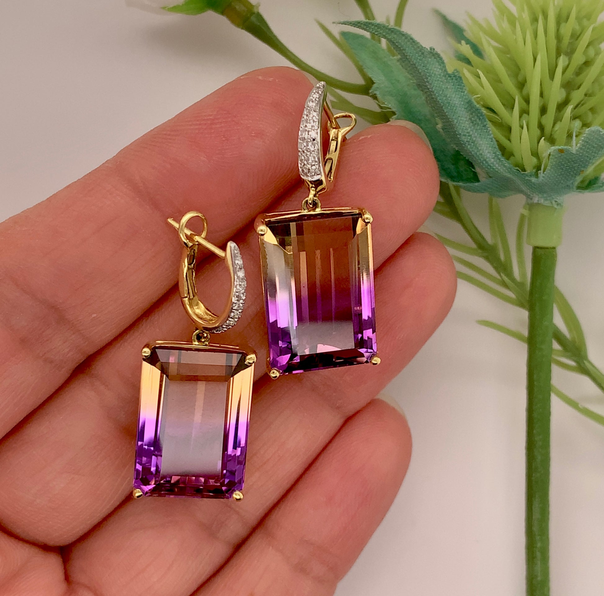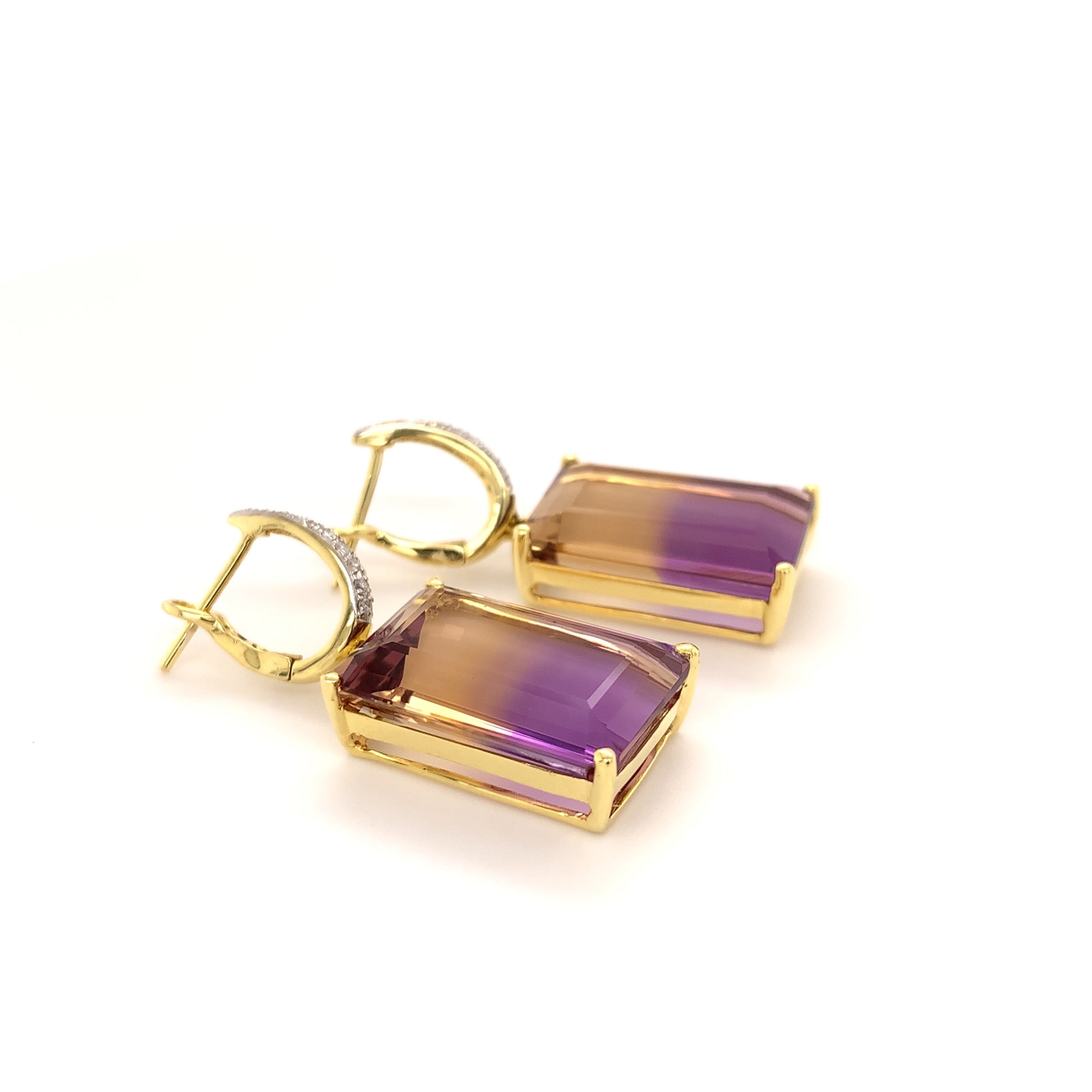 Stunning Ametrine cocktail earrings. High brilliance, octagonal faceted, purple-golden honey yellow tone, 28.7 carats natural Ametrine encased in four bead prongs, accented with round brilliant diamond hinged lock. Handcrafted cocktail earrings set in high polished 14 karats yellow gold.