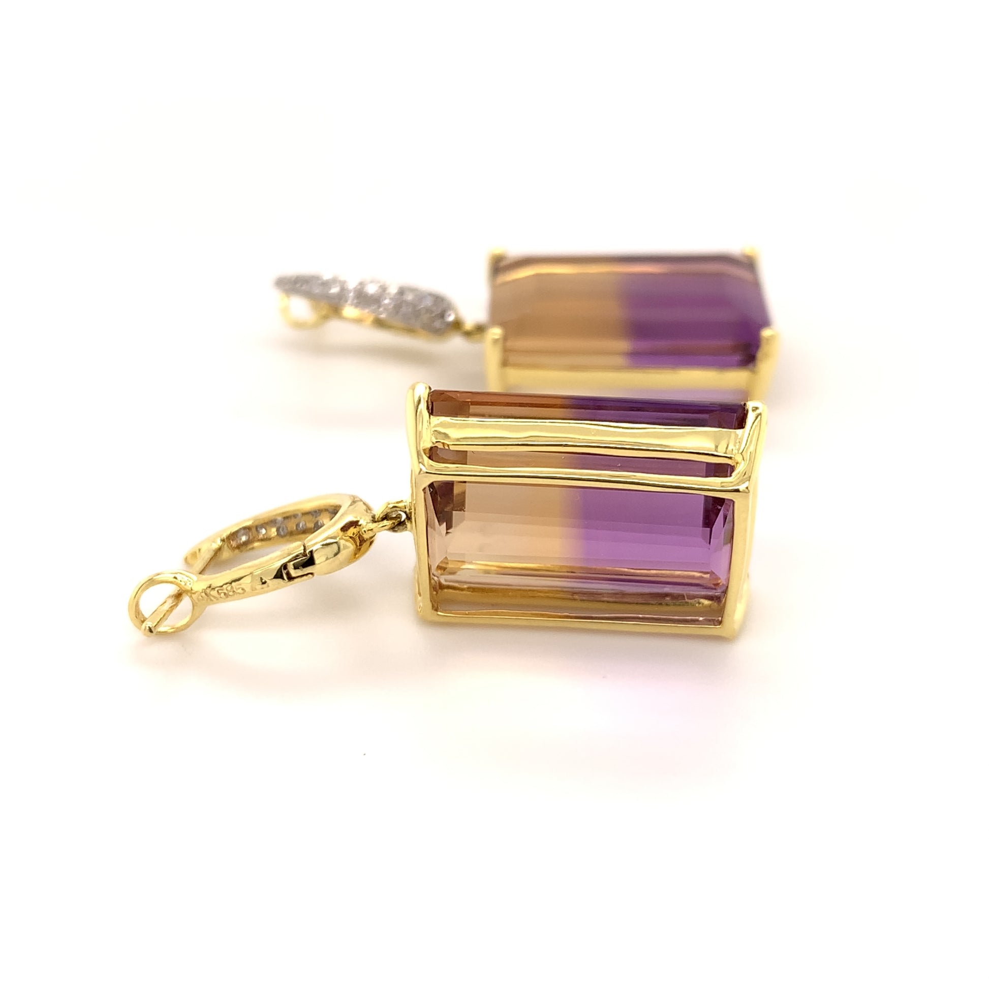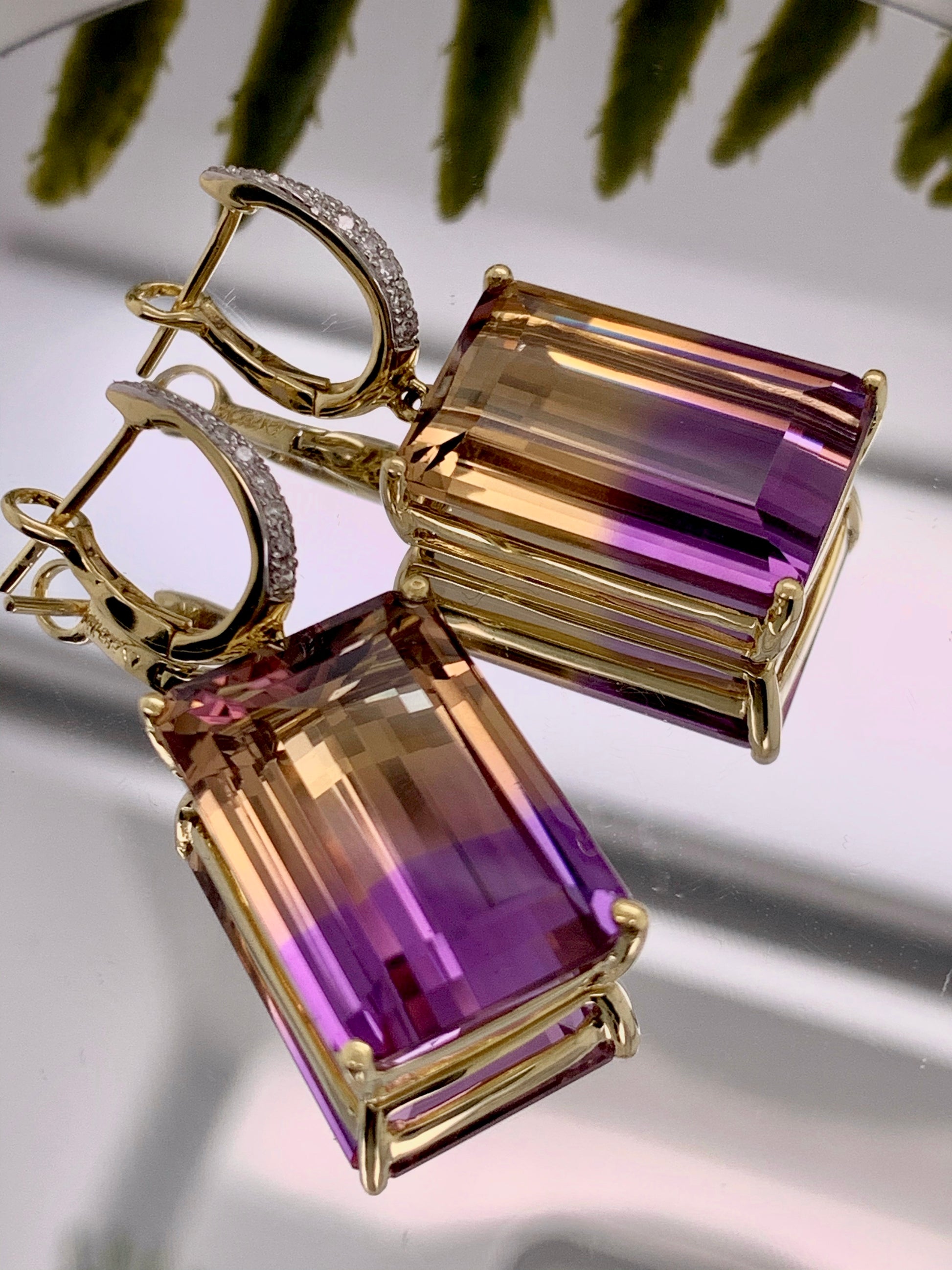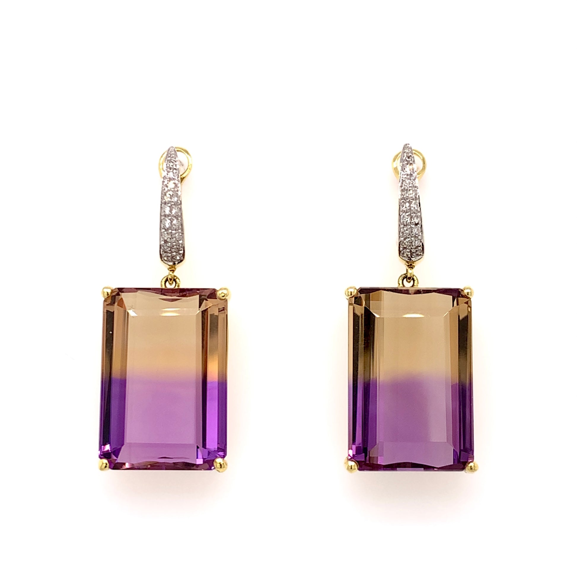 Stunning Ametrine cocktail earrings. High brilliance, octagonal faceted, purple-golden honey yellow tone, 28.7 carats natural Ametrine encased in four bead prongs, accented with round brilliant diamond hinged lock. Handcrafted cocktail earrings set in high polished 14 karats yellow gold.