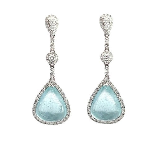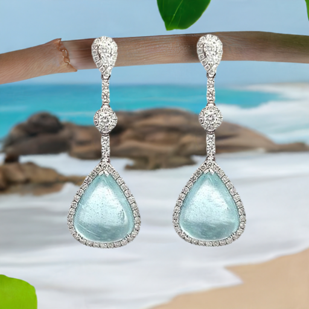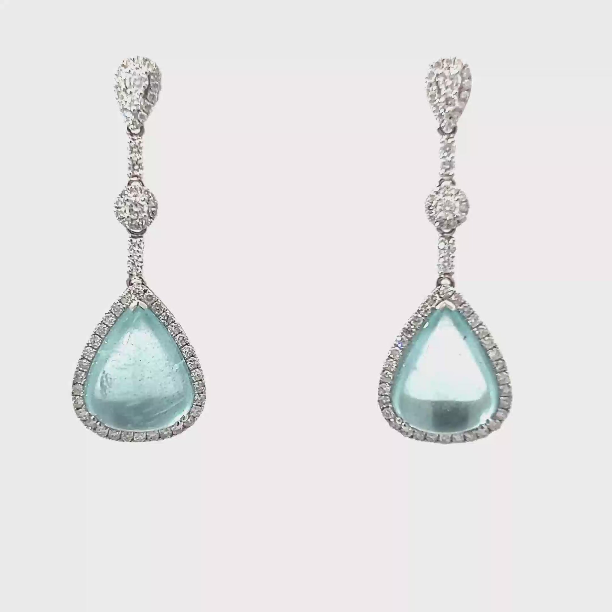 Statement Aquamarine dangling earrings, containing 16.38 carats,natural greenish-blue tone cabochon aquamarine, accented with round brillaint cut diamonds. Handcrafted dangling design set in 14 karats white gold wth push back post and circle butterfly.