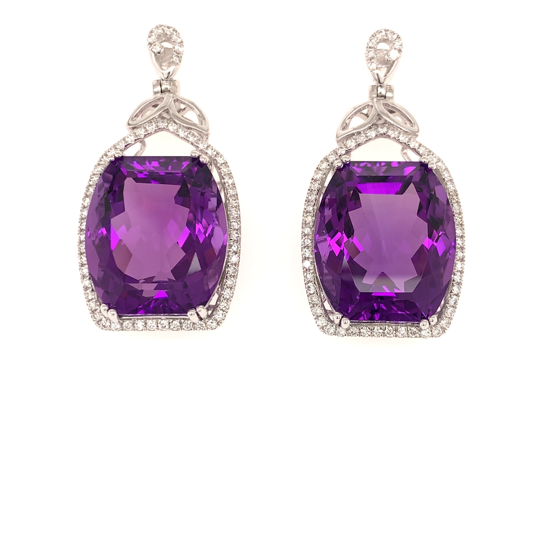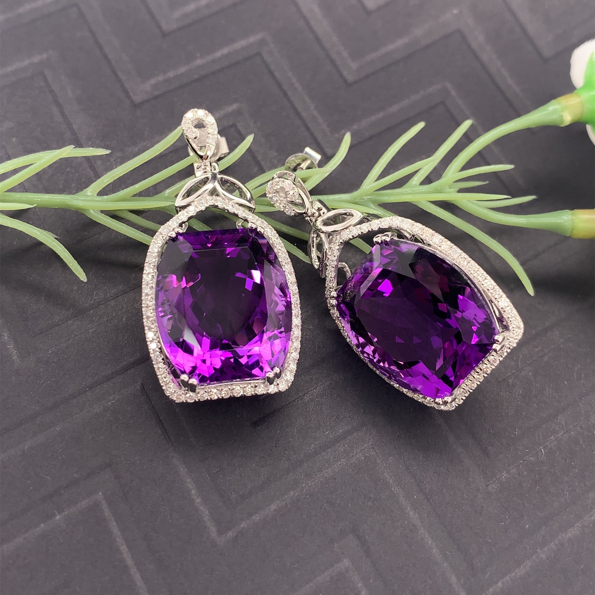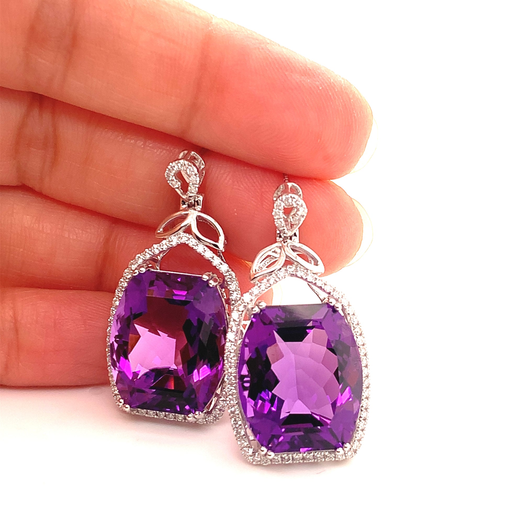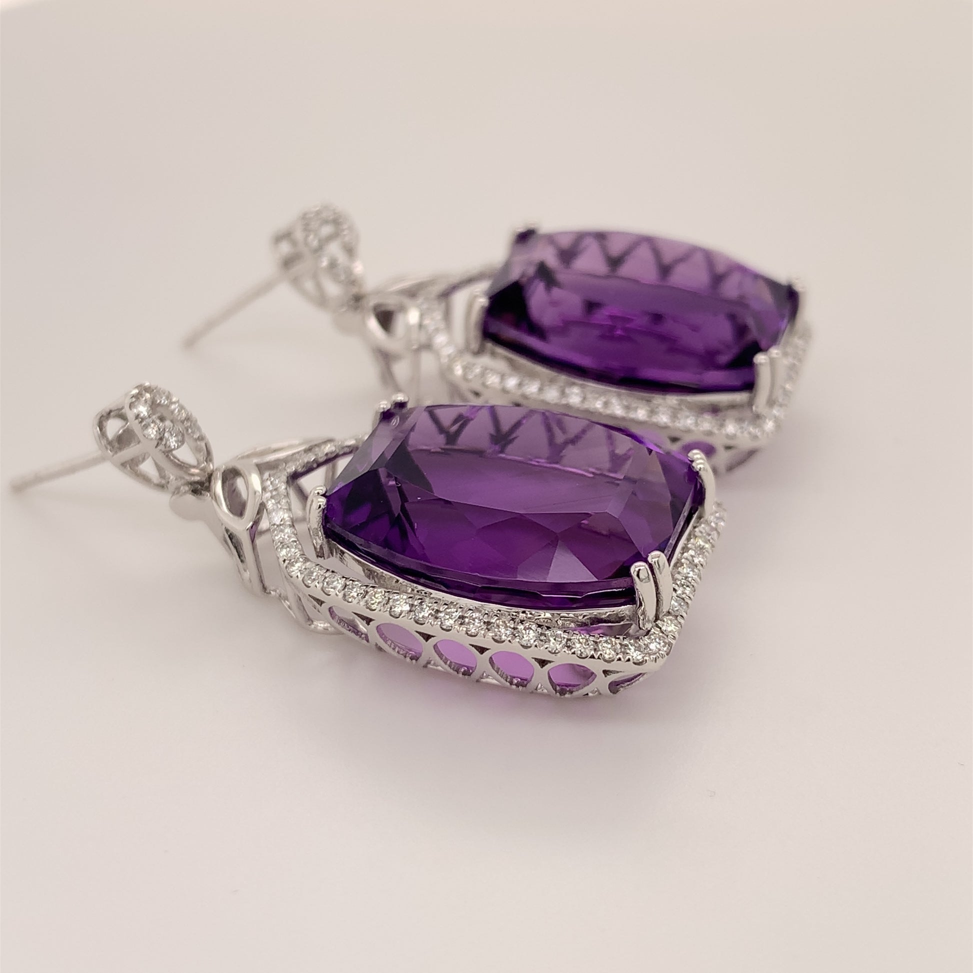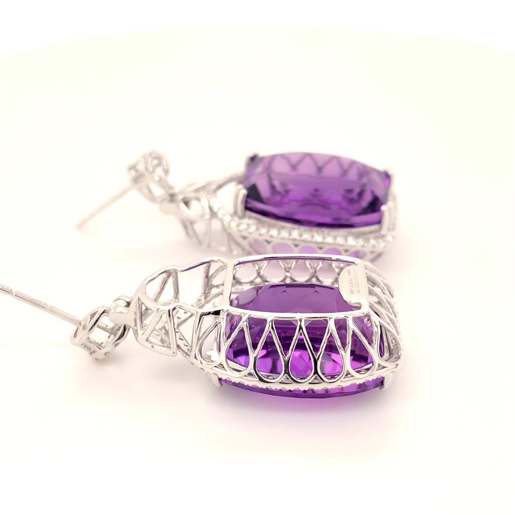 Glamorous amethyst dangling earrings. Hi brilliance, high quality, transparent clean, cushion faceted, rich purple tone 2 matching natural amethyst encase with four bead prongs, mounted in high profile open basket, accented with round brilliant cut diamonds. Handcrafted dangling earrings set in 14 karats white gold, along with tapered post and butterfly post.