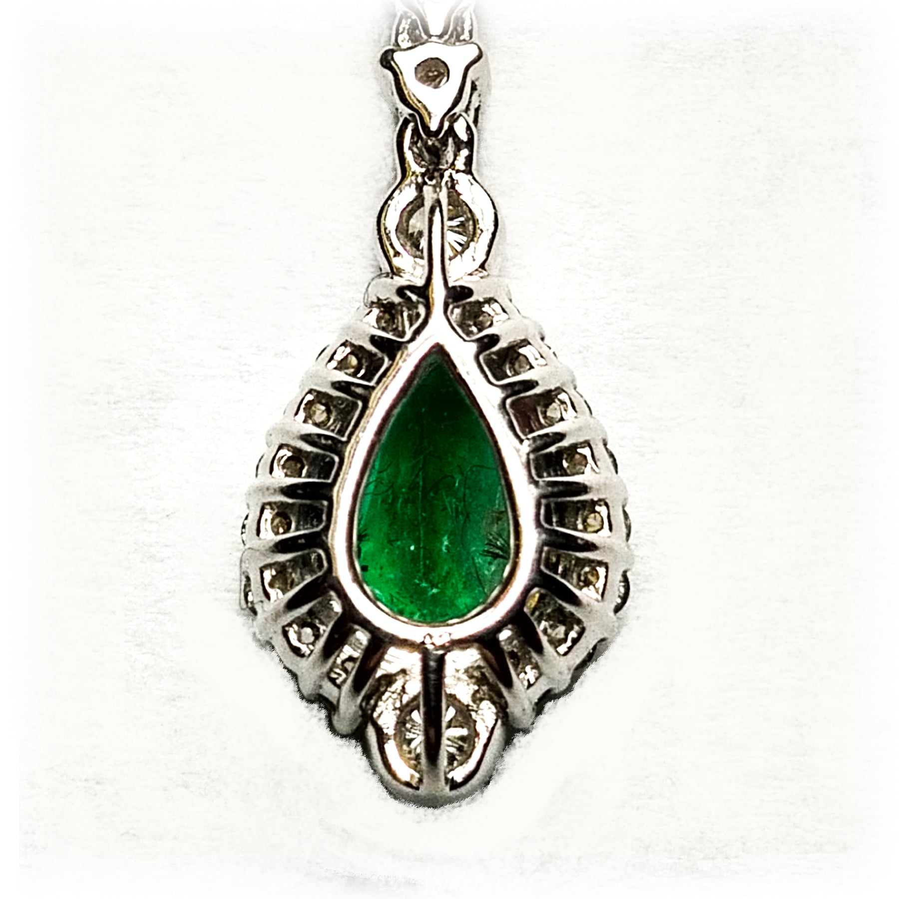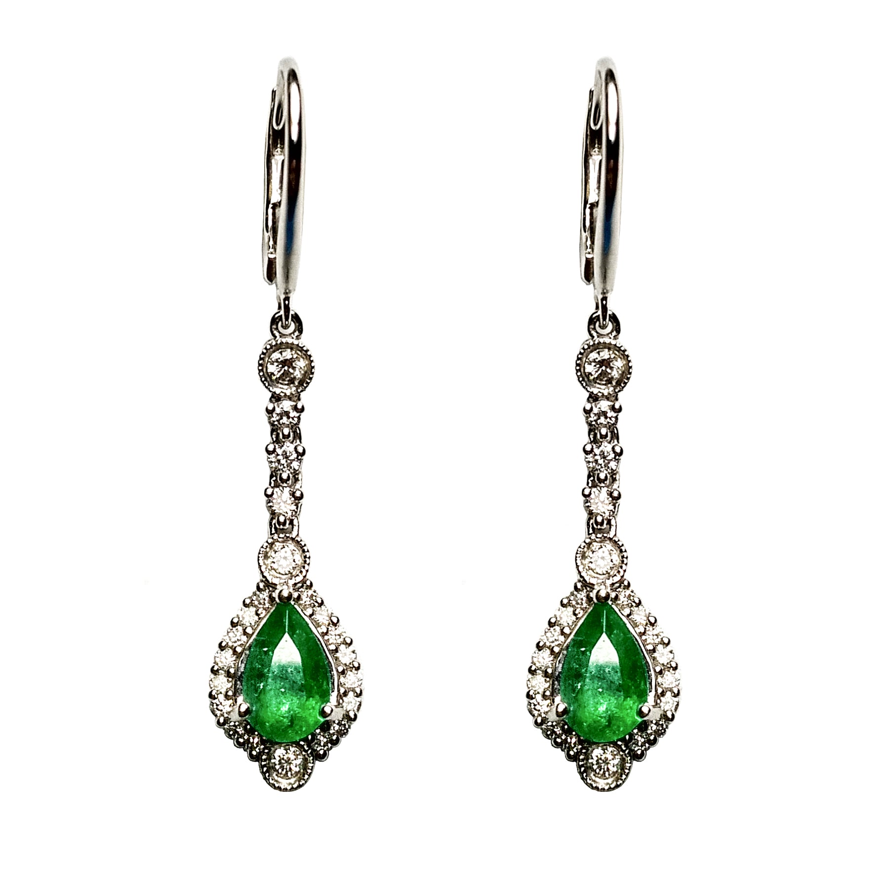Elegant pear shape emerald and diamond dangling earrings. Lively green pear shape matching emerald framed with round brilliant cut diamonds. Handcrafted dangling design set in 18 karats white gold.