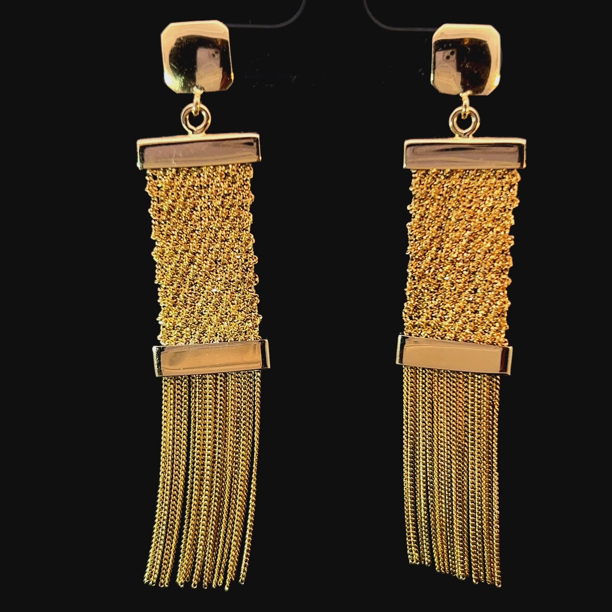 Stunning 14 karat yellow gold dangling earrings, Italian craftsmanship, with mesh and dangling fringe, with post and push back butterfly.