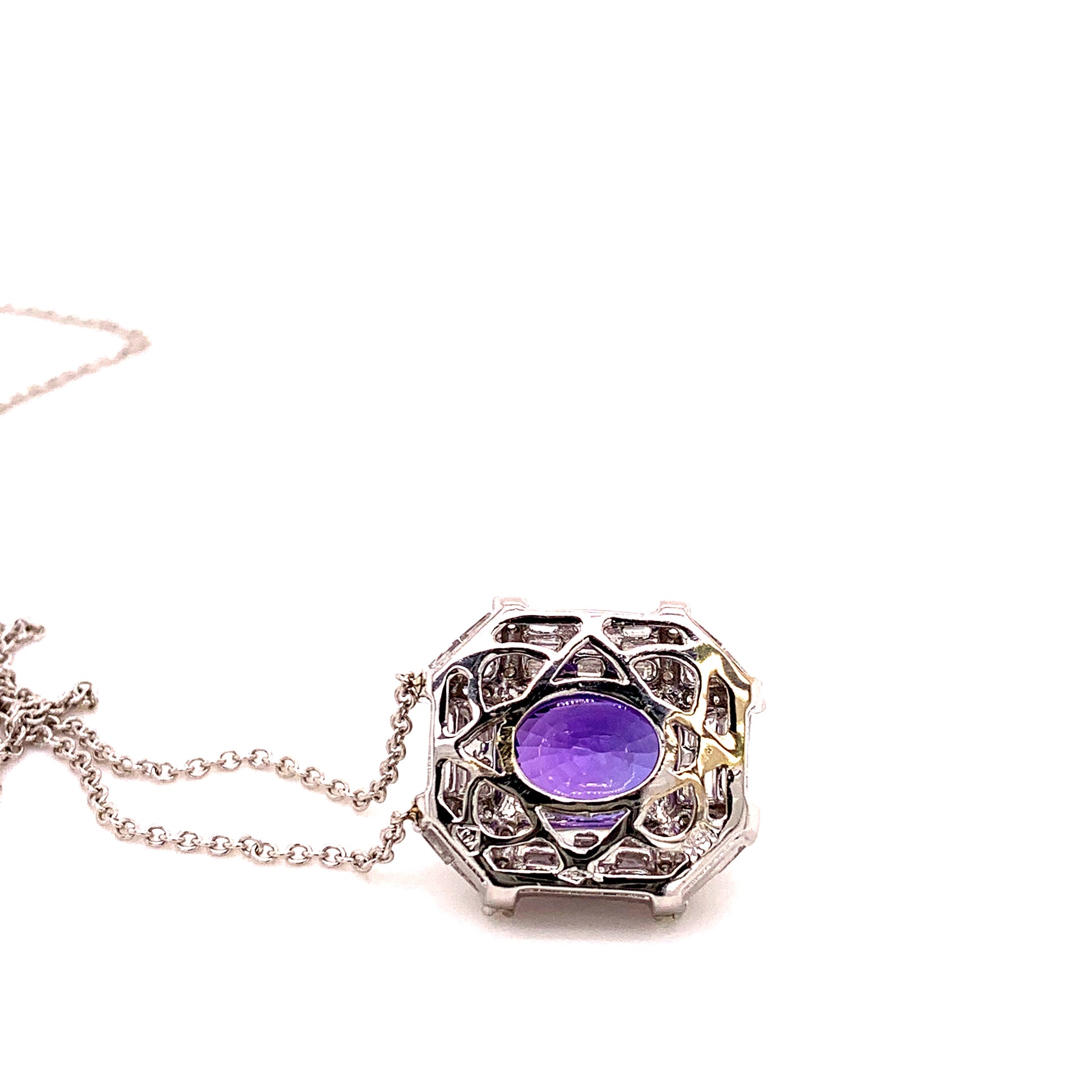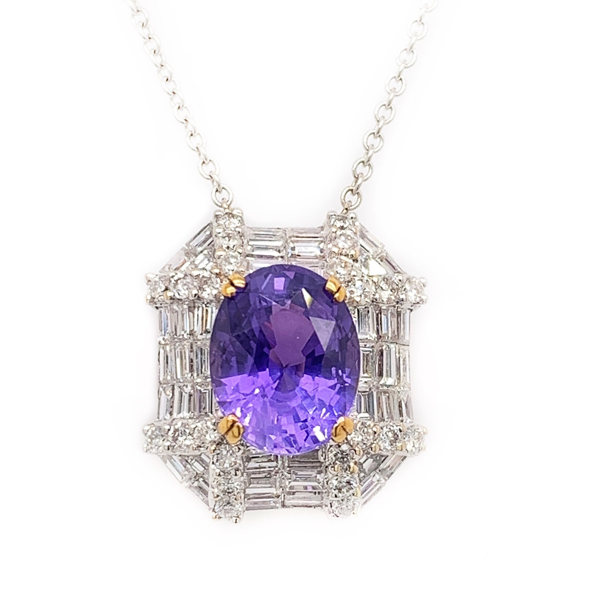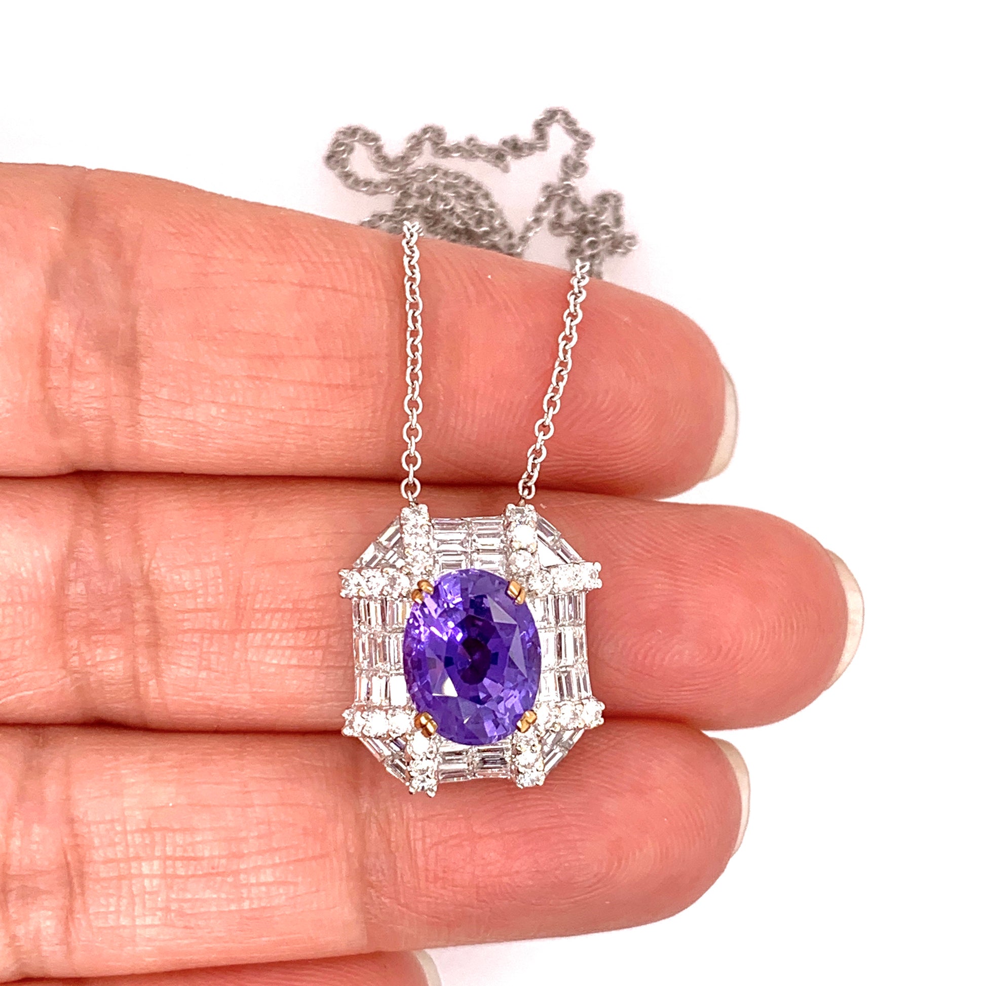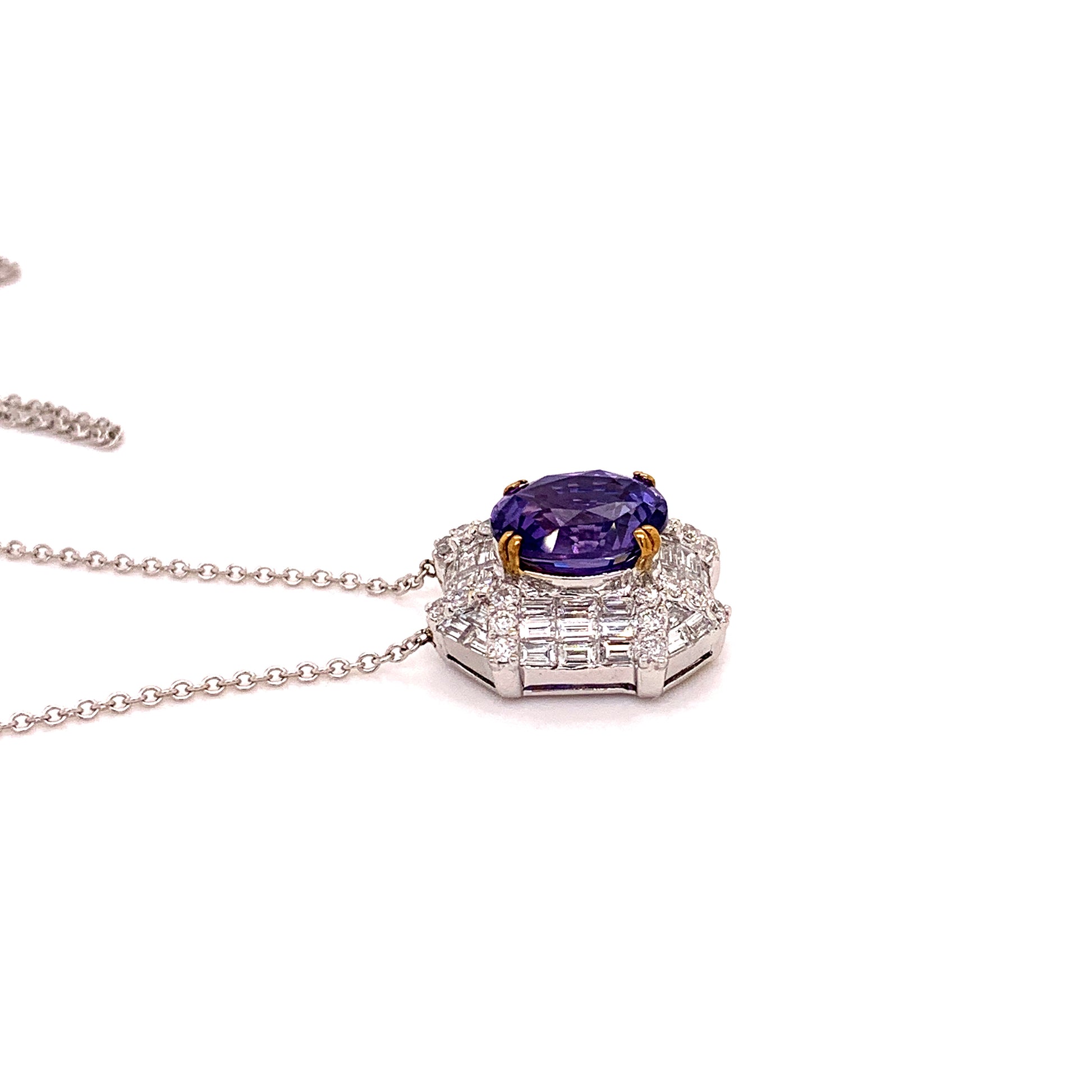 Rare unheated sapphire pendant. High luster, rare unheated, Sri Lanka origin, oval faceted, 3.83 carats color-changing violet-purple sapphire mounted in high profile with eight prongs, accented with sparkling baguette diamonds, round brilliant cut diamonds. Beautiful handcrafted design set in 18 karats white gold, along with 17.5 inches long link curb chain attached with spring clasp. Statement piece!